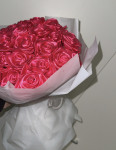 Декоративный букет ручной работы из 51 розы, украшенной атласной лентой.