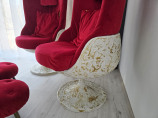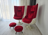 Verhoilu on pehmeää punaista samettia, miellyttävä ihoa vasten ja ylellisen tuntuinen. Runko on muovia, jossa on koristeellinen taiteellinen reliefipinta. Selkänoja on valmistettu vanerista, tiheästä vaahtomuovista ja kankaasta. Istuin on lämmin ja napakka. Rakenne on kestävä, mukava ja kodikas.