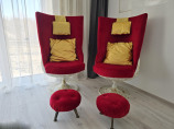 Myydään pari eksklusiivisia design-nojatuoleja jalkaraheineen. Nojatuolit on valmistettu mittatilaustyönä, ja maailmassa on vain kaksi tällaista kappaletta. Kyseessä on taide-esine – kotiin, showroomiin, salonkiin, studioon, kuvaustilaan tai edustavaan työhuoneeseen. Ne muuttavat tilan ilmeen täysin.